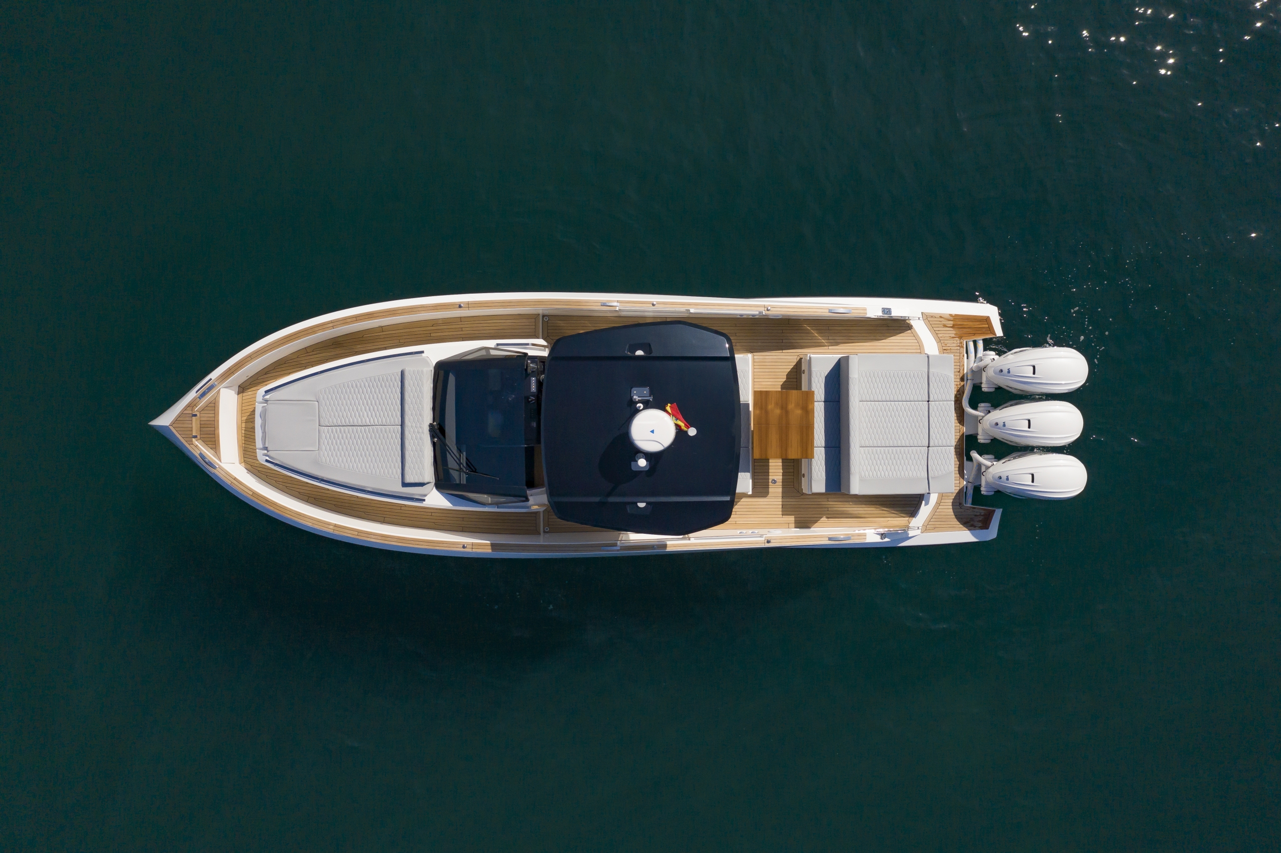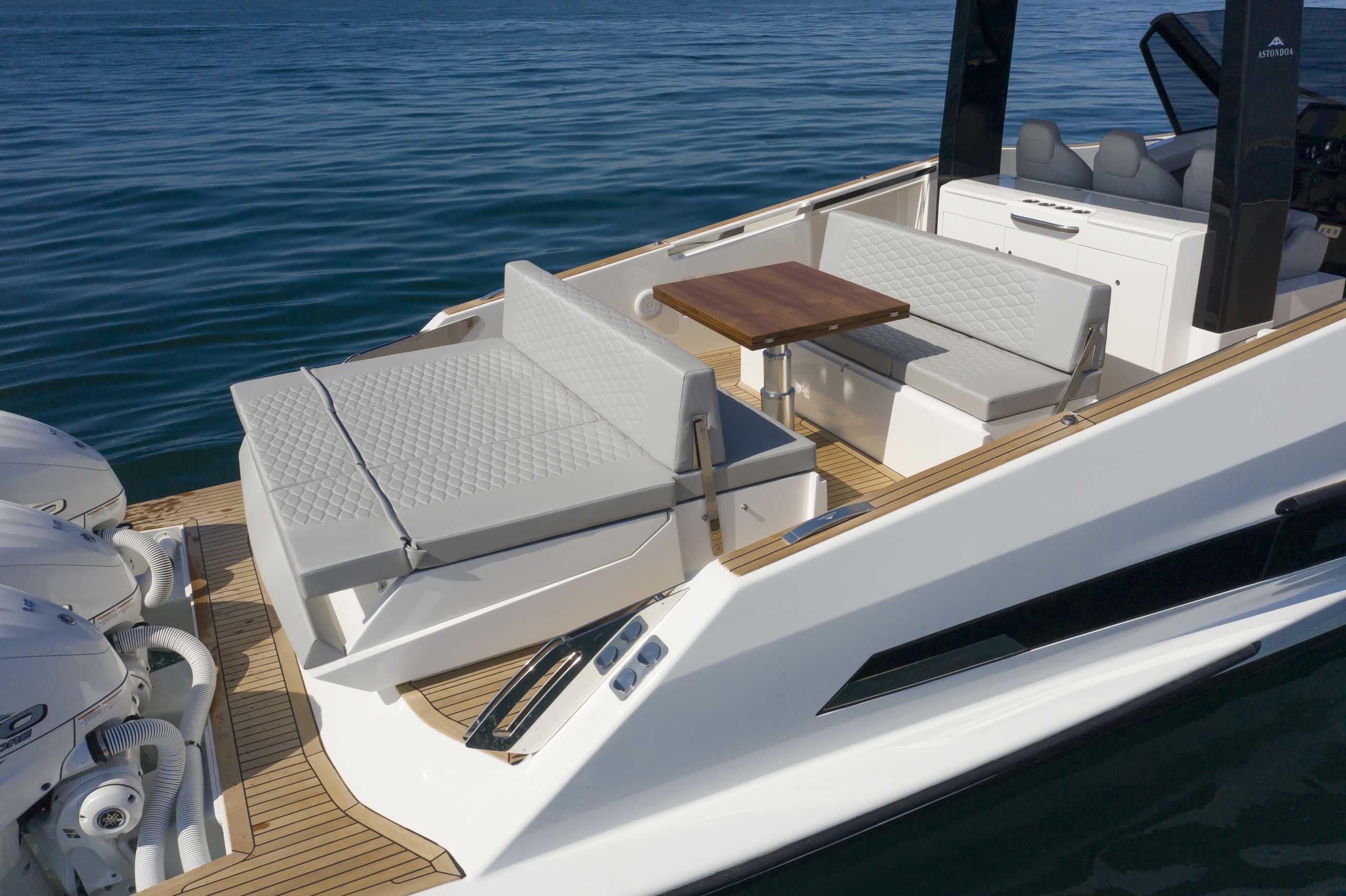 Il design dello scafo dell’Astondoa 377 Coupe Fuoribordo è all’avanguardia, caratterizzato da linee pulite e angoli aerodinamici. La prua audace e invertita taglia l’acqua con grinta ed è completata dai fianchi scolpiti dello scafo. Lo scafo tridimensionale enfatizza il volume allungato della barca, mentre la sua larghezza di 11′ 7″ conferisce sostanza, forza e stabilità.