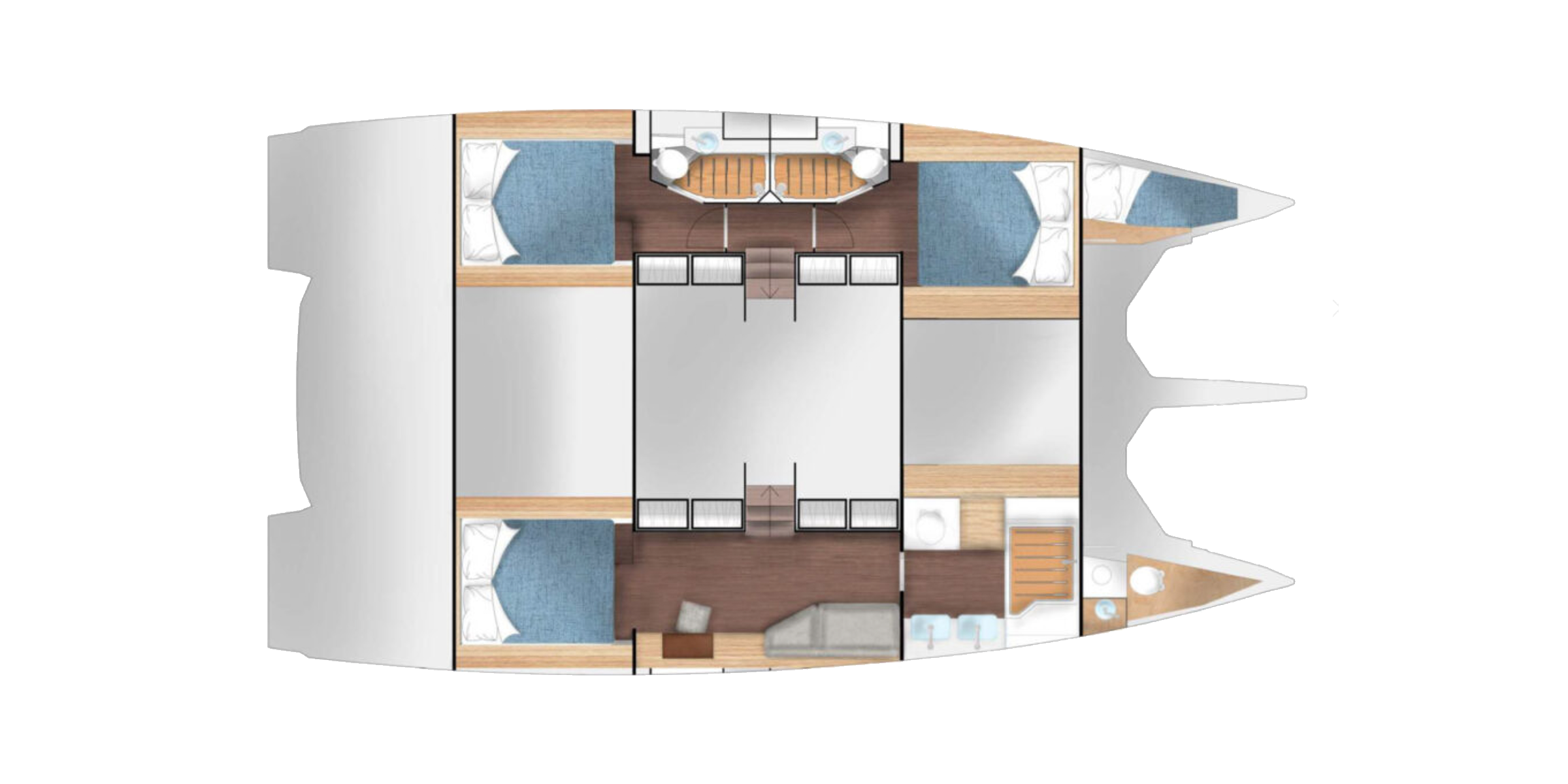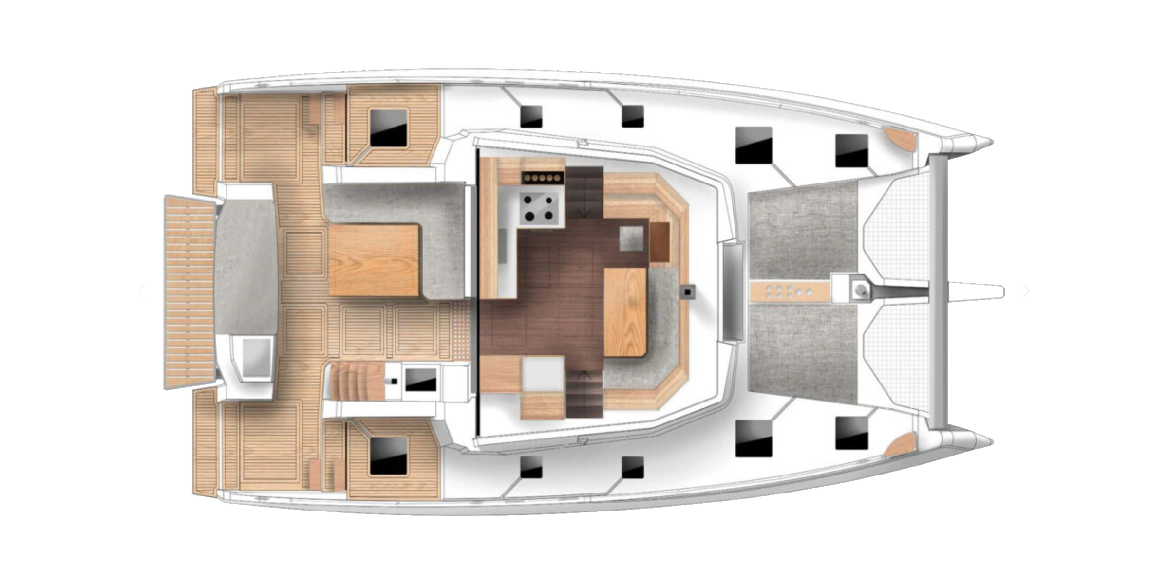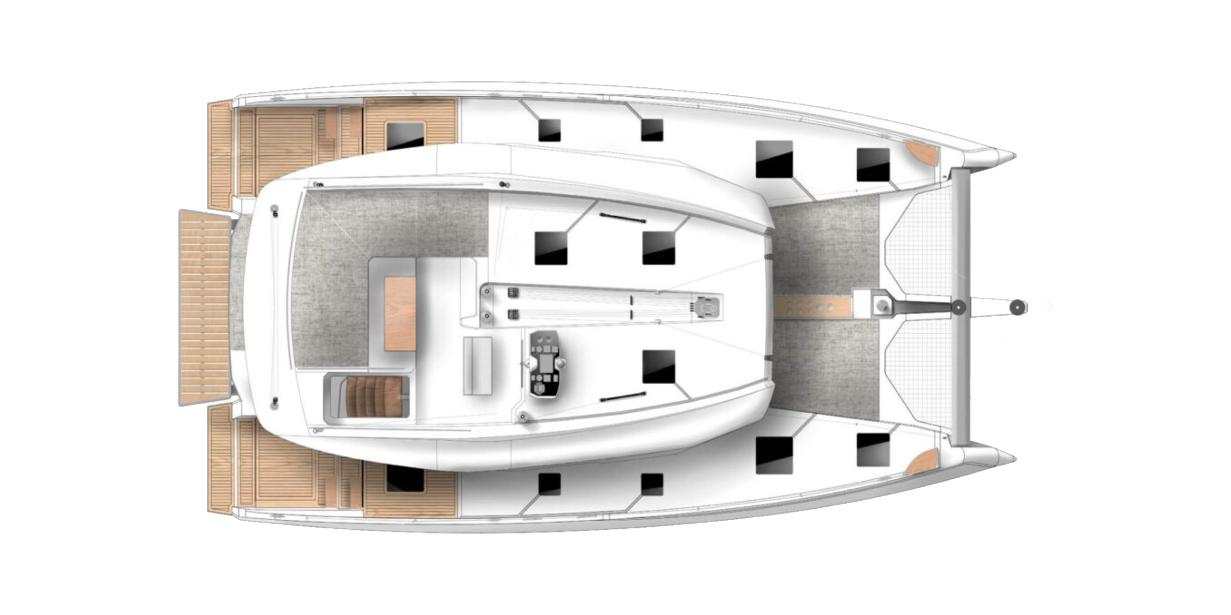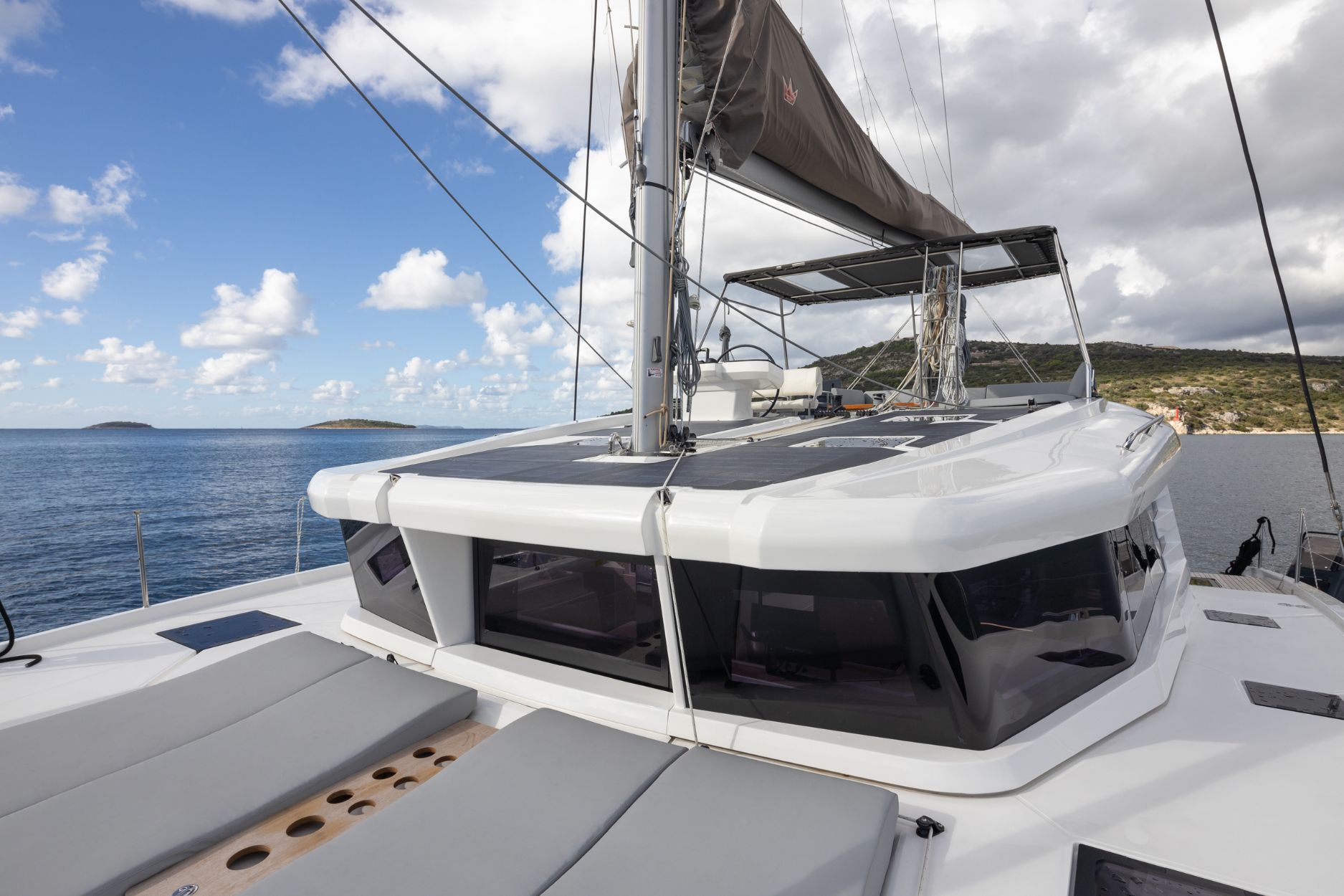 Il Dufour Catamarans 44 Sail presenta un perfetto bilanciamento tra il piano di coperta, lo spazio del pozzetto, tetto e il ponte di prua divisi per 1/3 della lunghezza totale.