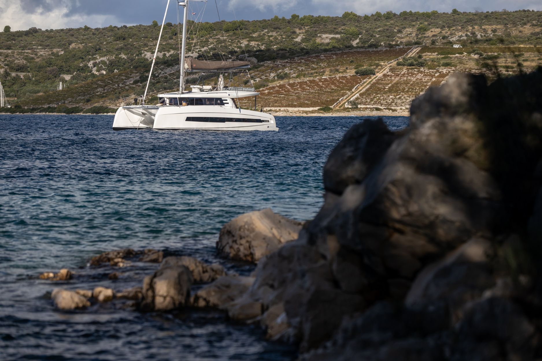 Il Dufour 44 Catamarans presenta un perfetto bilanciamento tra il piano di coperta, lo spazio del pozzetto, tetto e il ponte di prua divisi per 1/3 della lunghezza totale.