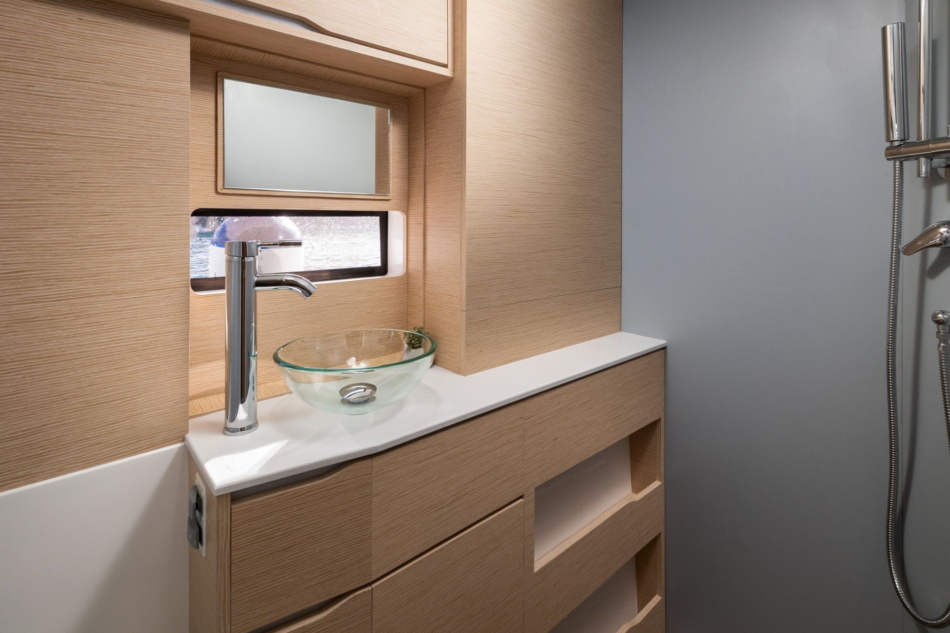 Grazie alla posizione prodiera dell’albero non ci sono ostacoli tra la grande cucina a L, il tavolo da carteggio fronte mare ed il salone, rendendolo uno spazio ideale e fruibile. C’è molto spazio di stivaggio e la cucina è dotata di tutti gli elettrodomestici necessari. Un finestrino elettrico scorrevole sulla tuga permette la comunicazione diretta tra il salone, la cucina e la zona prendisole a prua.
